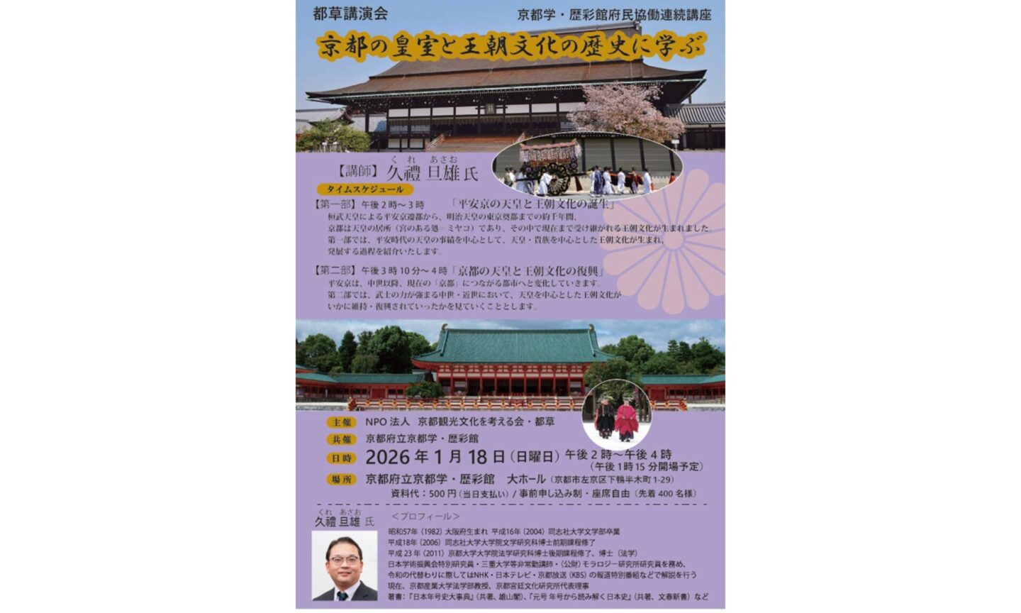募集案内participate in events その他行事 第17回都草講演会 [開催日・期間] 2026.01.18 [開 催 場 所] 歴彩館 歴史探訪部会 第121回歴史探訪会東部会 渉成園 [開催日・期間] 2025.12.02 [開 催 場 所] 渉成園 めざせ 京都検定1級!! 京都検定1級合格対策直前演習会 [開催日・期間] 2025.11.15 〜2025.11.16 [開 催 場 所] 平安女学院大学京都キャンパス、お茶の水女子大学 行事予定Event schedule 歴史探訪部会 行事予定 第120回歴史探訪会深草支部 「仁王門通りを歩く」 要申込 [開催日・期間] 2025.10.24 [開 催 場 所] インクライン 美化活動部会 行事予定 第238回美化活動 萬福寺 [開催日・期間] 2025.11.11 [開 催 場 所] 萬福寺 研究発表会 行事予定 第146回研究発表会 [開催日・期間] 2025.10.09 [開 催 場 所] ひと・まち交流館 その他行事 行事予定 第43回文化交流部会 禅華院 [開催日・期間] 2025.11.07 [開 催 場 所] 禅華院 一覧を見る