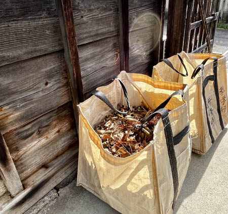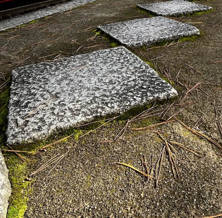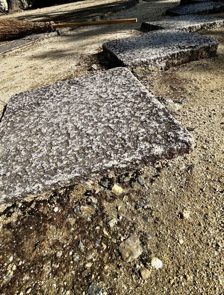 庭には松が立ち並び、辻岡化主から「見渡せば綺麗に見えるが、そうではない」のお話し通り、その場所に立てば松葉が散在していました。清掃中の写真ではわかりづらいのですが、清掃前後の石條をアップで写した写真をご覧いただくと、きれいになっているのがわかります。