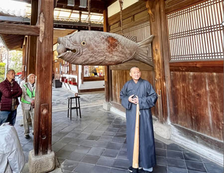 斎堂回廊で、釣ってある魚形の開梛(かいぱん)のお話をうかがいました。開梛は木魚の原形で、我々がよく見る木魚はここから生まれました。通常は修行僧が木棒で叩いて食事を知らせるのですが、本日は予定が変わったため、辻岡化主が木棒で割るがごとく叩く実演をしてくださいました。