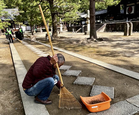 10時に斎堂横に集合、萬福寺化主の辻岡智幸様からの挨拶の後、清掃道具一式をお借りして、本日の美化活動が始まりました。