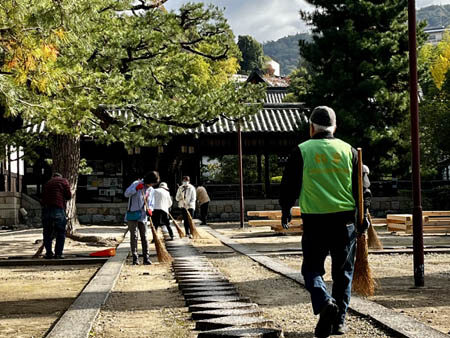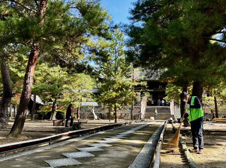 要望された清掃箇所は、天王殿、大雄宝殿(だいおうほうでん)、法堂前庭の落葉清掃でした。参道中央の正方形の石列は石條(せきじょう)と言い、龍の背のウロコを表し、住持のみが立つことができます。
