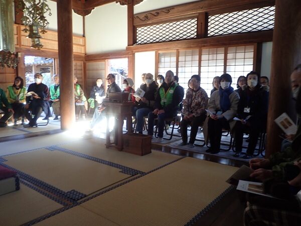 午前11時ごろ作業を終了し、本堂に集まり、ご住職の伊藤光順様より、安楽寺の歴史、本尊や本堂内の木像などについて説明していただきました。
