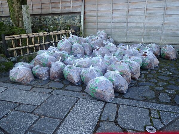 参加者は本堂前の庭、山門の外、書院周りの庭、松虫鈴虫供養塔に続く路、墓地周辺に分かれて、落葉を集めました。本堂前の庭などでは、すでに落葉が寺の方により集められているところもありましたが、落葉は多く、境内が広いこともあり、作業は、大人数でもほぼ1時間を要しました。集めた落葉は74袋に達しました。