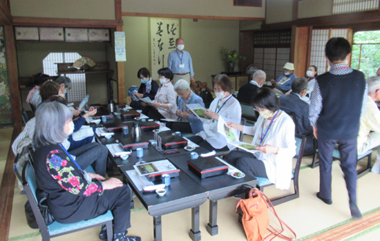 白河院でも職員の方から説明を受けたあと、池泉回遊式のお庭を周り、武田五一が設計した数寄屋造りの建物で和風弁当いただき、再び記念写真を撮って散会しました。
