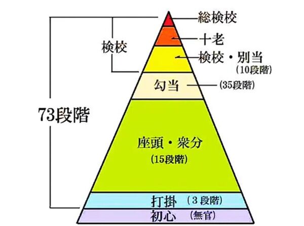 その間、組織維持のため江戸幕府や清華家久我家の権威を背景に座内の階級(座頭・勾当・別当・検校)を官位、金銭には官金、といった言い方で権威付を行い、座内の階級(官位)を金銭にて購入する制度を徹底、階級の上下関係は厳しく維持されました。検校になるまでには719両もの資金を要しましたが検校には一部の高利貸を行った鳥山検校等を除けば、優れた人物が輩出されています。