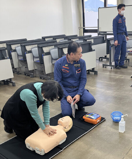 先方作成テキストに基づき、応急手当の重要性、心肺蘇生実施方法(含;AED使用方法)、気道異物除去法、止血法、傷病者管理法等について説明を受けた
