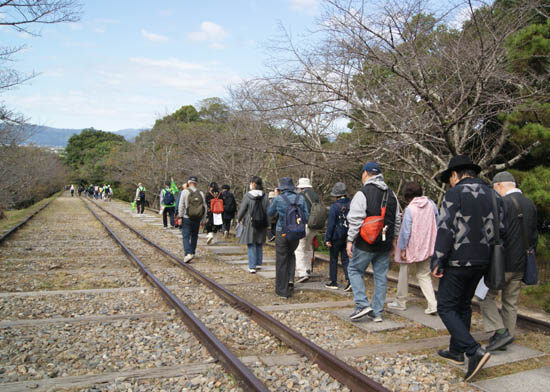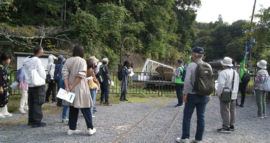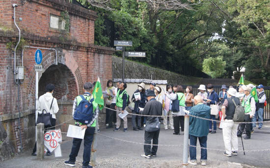 ねじりまんぽの由来と役目などを安田会員が説明。併せて北垣国道京都府知事が揮毫したトンネルの入り口の扁額の案内もしました。