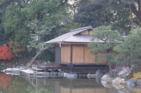 玄関からの賓客は大広間の閬風亭につながり、園内を一望できます。軒を深くしているのは、観月の際に池に映る月を愛でる工夫のようです。池は名付けて印月池。