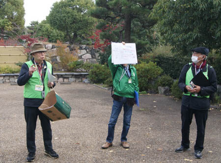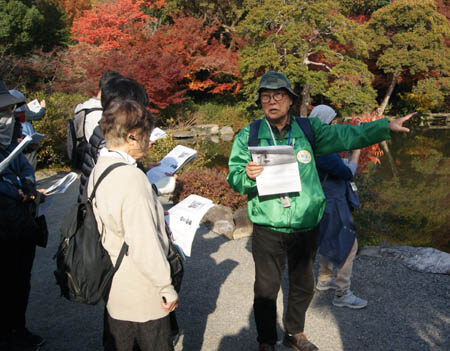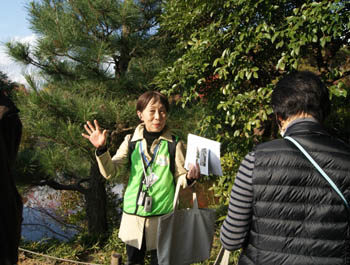 始めに渉成園の説明をする福井大作会員(左)