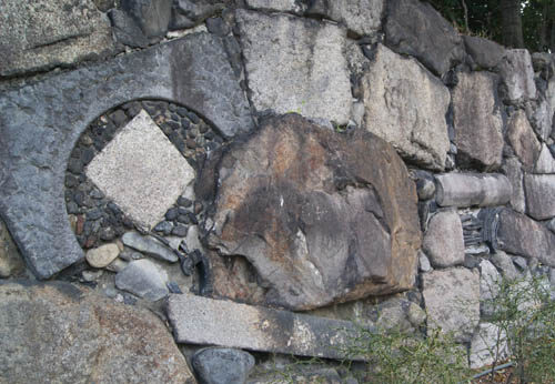 正門の正面には、火災で被災した建物の礎石や石臼等を利用した見事な石積が見られます。