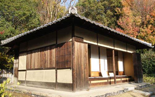 この建物はお寺の山門に当たります。二階は茶室になっており、両脇には桜園が設けられています。正面には阿弥陀仏の園林堂が見えます。「南無阿弥陀仏、南無阿弥陀仏」