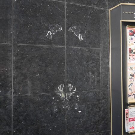 中央口にある6本の柱に世界35か国の銘石288種が名前と産地入りで展示してあり(一般の人もほぼ気づかない)中にはドイツの石灰岩ジュライエローには「アンモナイト」の化石も散見。