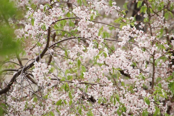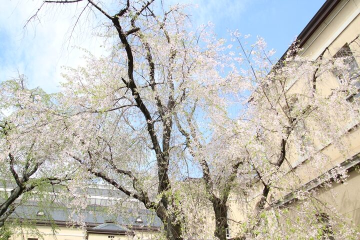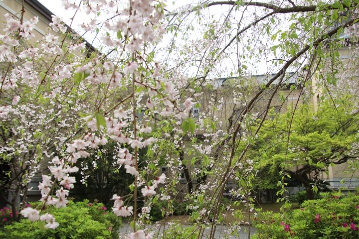 旧本館中庭の桜のラストを飾る紅八重しだれ桜🌸の