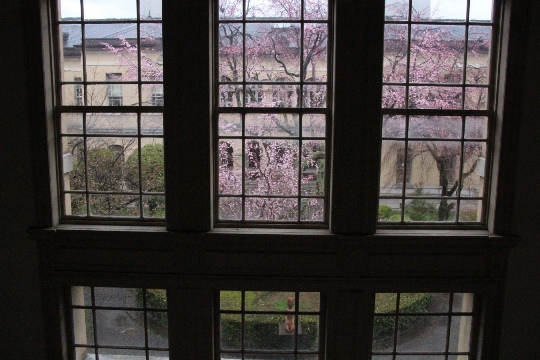東側の窓からの景色が少々変わりますが、旧本館中庭の桜は、今年も訪れる皆様